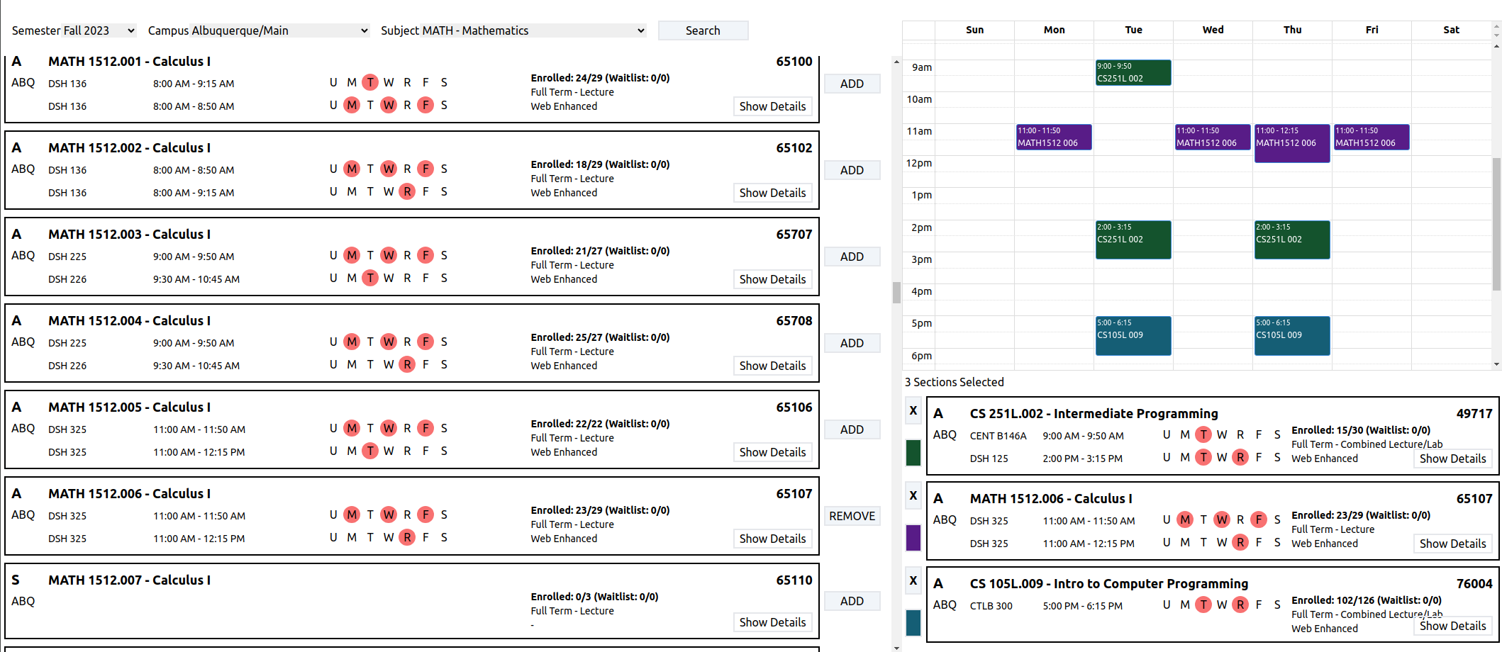 The database for this service is kept up-to-date automatically via a daily script that extracts data from a public-facing XML file containing scheduling information. This file is made available by UNM specifically for projects like this.